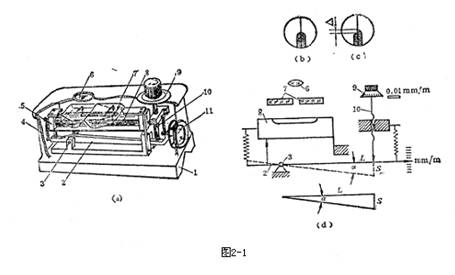 若被測點位置使反射鏡座傾斜α角,則經(jīng)其反射后的光線,使活動分劃板3上的十字象對固定分劃板“10”偏移-Δi。由絲杠測微機構測出此位移量Δ2,便可知道反射鏡座相對于光軸(理想直線)的傾斜角α,如圖2—3(b)所示。