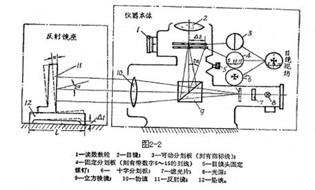 儀器由本體及反射鏡座兩部分組成。本體包括一平行光管及一讀數(shù)顯微鏡,其光學系統(tǒng)如圖2—2所示。