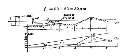 10)以適當比例按表2—1中的累積值yi作誤差曲線,如圖2—4(b)所示。按最小包容區(qū)域的判別準則(高—低—高或低—高—低)作兩條平行直線包容誤差曲線,沿縱坐標方向兩包容直線間距離即直線度誤差值f-。其合格條件為f-≤t-( t-——直線度公差)。