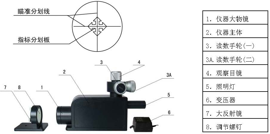 6、變壓器 7、望遠(yuǎn)物鏡 8、可調(diào)式反射鏡 9、調(diào)節(jié)螺釘