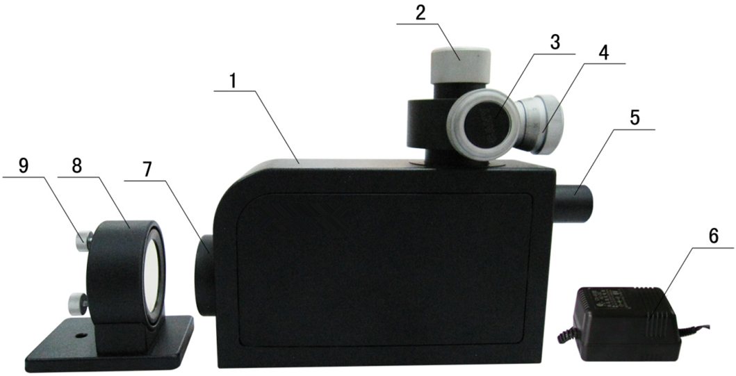 1、儀器底座調(diào)節(jié)螺釘   2、儀器主機(jī)   3、光源   4、測微器   5、觀察目鏡