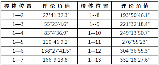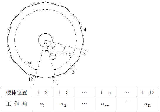 棱體工作角是指各工作面與第一工作面所對(duì)應(yīng)的中心角(即兩工作面中心法線之間的夾角)。如圖所示,以12面體為例,第一面為0°工作面,其它各面與第一面組成11個(gè)工作角。