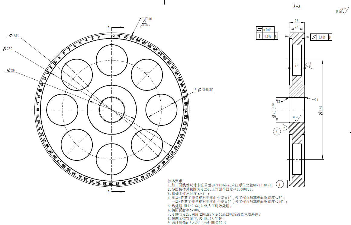 9、工作面表面粗糙度:Ra≤0.025um;