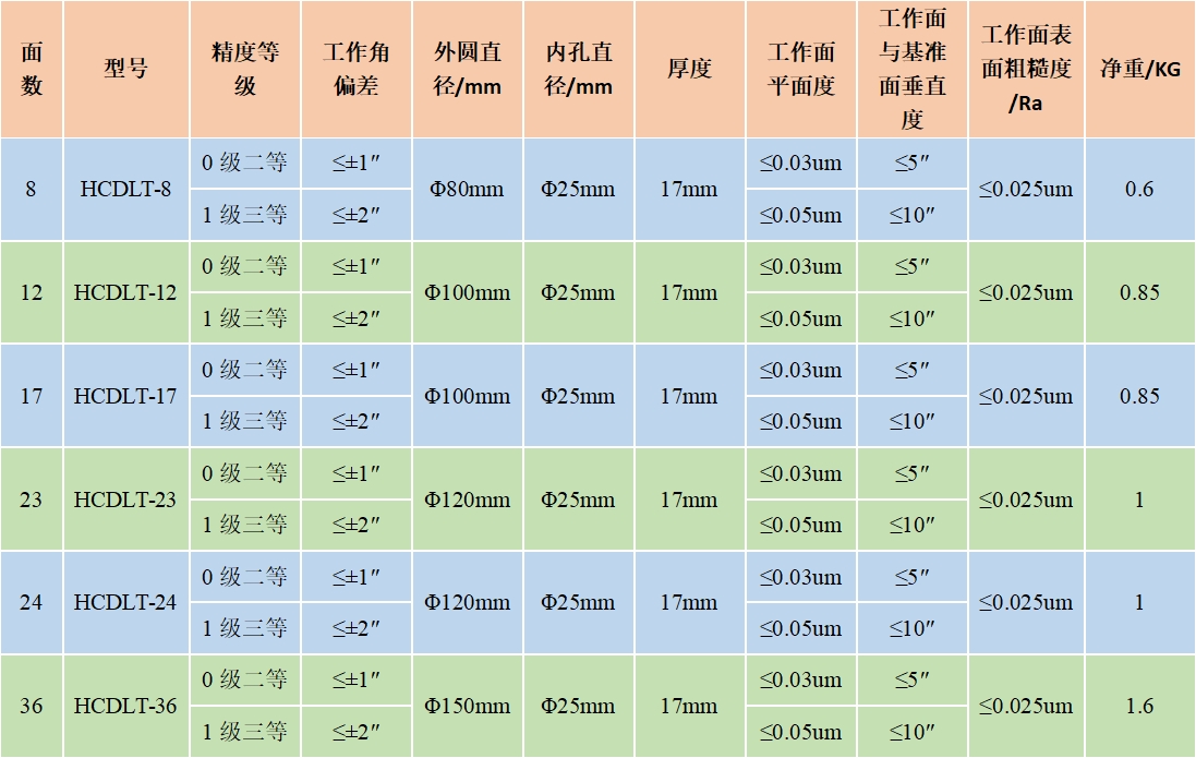 一個(gè)棱體的工作面總數(shù)能分360°的稱(chēng)為“整分?jǐn)?shù)正多面棱體”,用于整度數(shù)誤差的檢定,常用的有8,9,12,24,36面等不同規(guī)格。棱體的工作面總數(shù)對(duì)360°不能整分的稱(chēng)為“非整分?jǐn)?shù)正多面棱體”,用于整度數(shù)誤差和細(xì)分誤差的綜合檢定,常用的有17面(相鄰角為21°10′35.3″)和23面(相鄰角為15°39′7.8″)等不同規(guī)格。