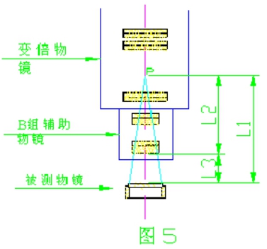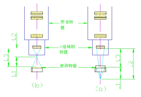 輔助物鏡的選擇原則是,物距(被測(cè)透鏡與物鏡第一面的距離)應(yīng)(近似地)不超出卡爪安裝透鏡面至物鏡第一面距離的允許范圍,因此: