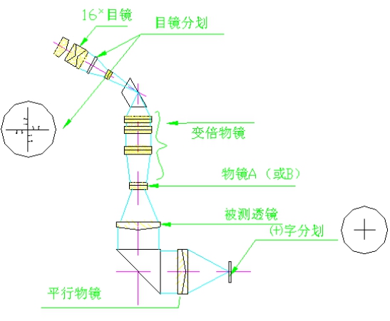 (2)根據(jù)膠合鏡片的焦距,參照前述方法選擇好輔助物鏡并調(diào)整好組合放大倍率。調(diào)節(jié)顯微鏡座使十字分劃清晰地成像在目鏡分劃面上。
